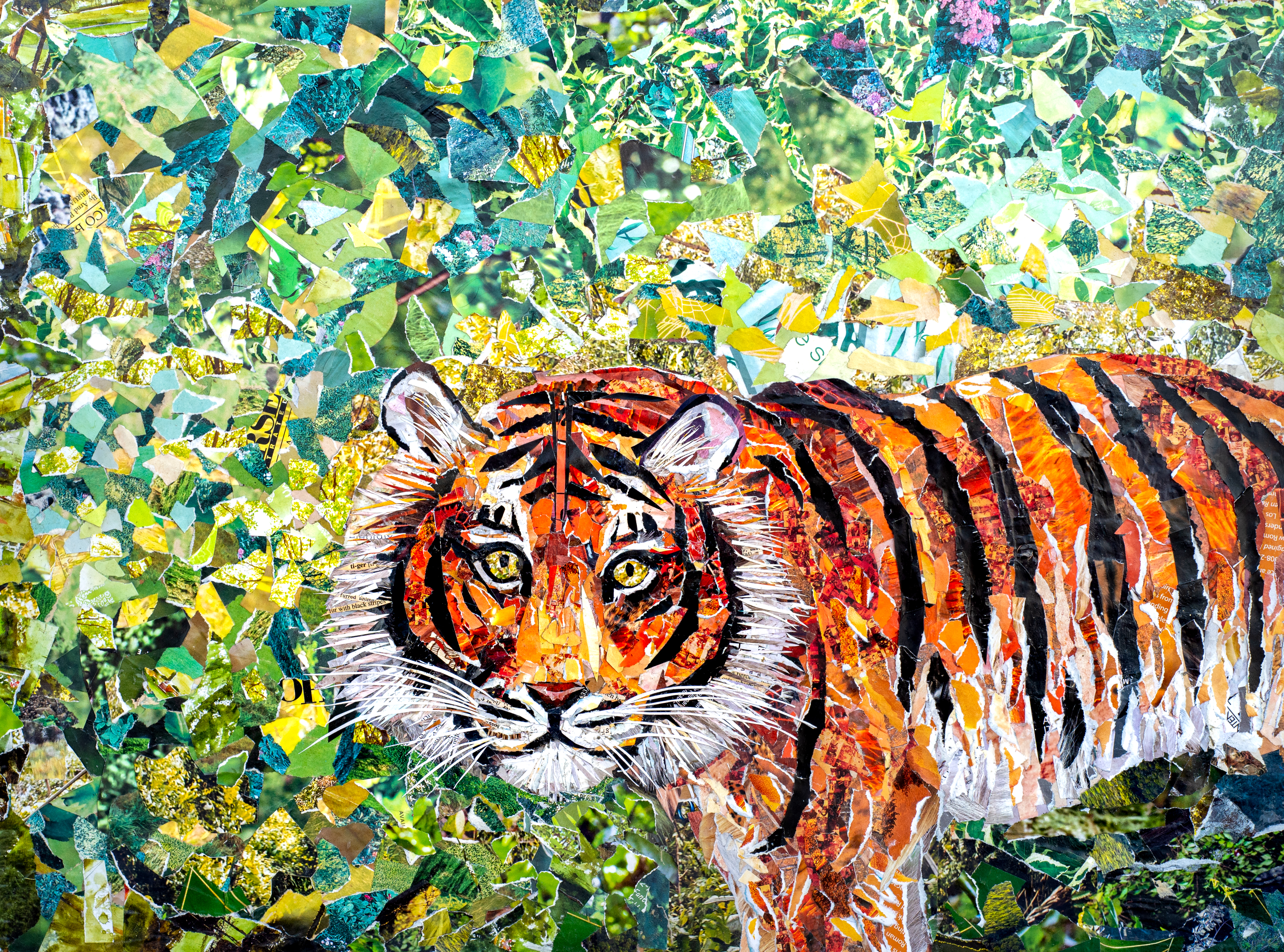 Thoughts:   Leslie Elaine says: I felt like making a new collage and wanted to do something Evan would like. I thought to do a tiger. I worked on it slowly over the course of 2 years - starting with the green background and eventually finishing with the details and words in the face. I chose many colors from magazines and calendars - including calendar photos of red rocks in Utah that worked well for the tiger's fur. To do the fur around his face, I used white paper and even dictionary paper! Can you see the word tiger? and "fur with stripes" in the fur of the face? I cut card stock to do the whiskers! :) I started this tiger for Evan before he chose Clemson, so it was really cool when I realized I had made him his school mascot without knowing it! Go Tigers!