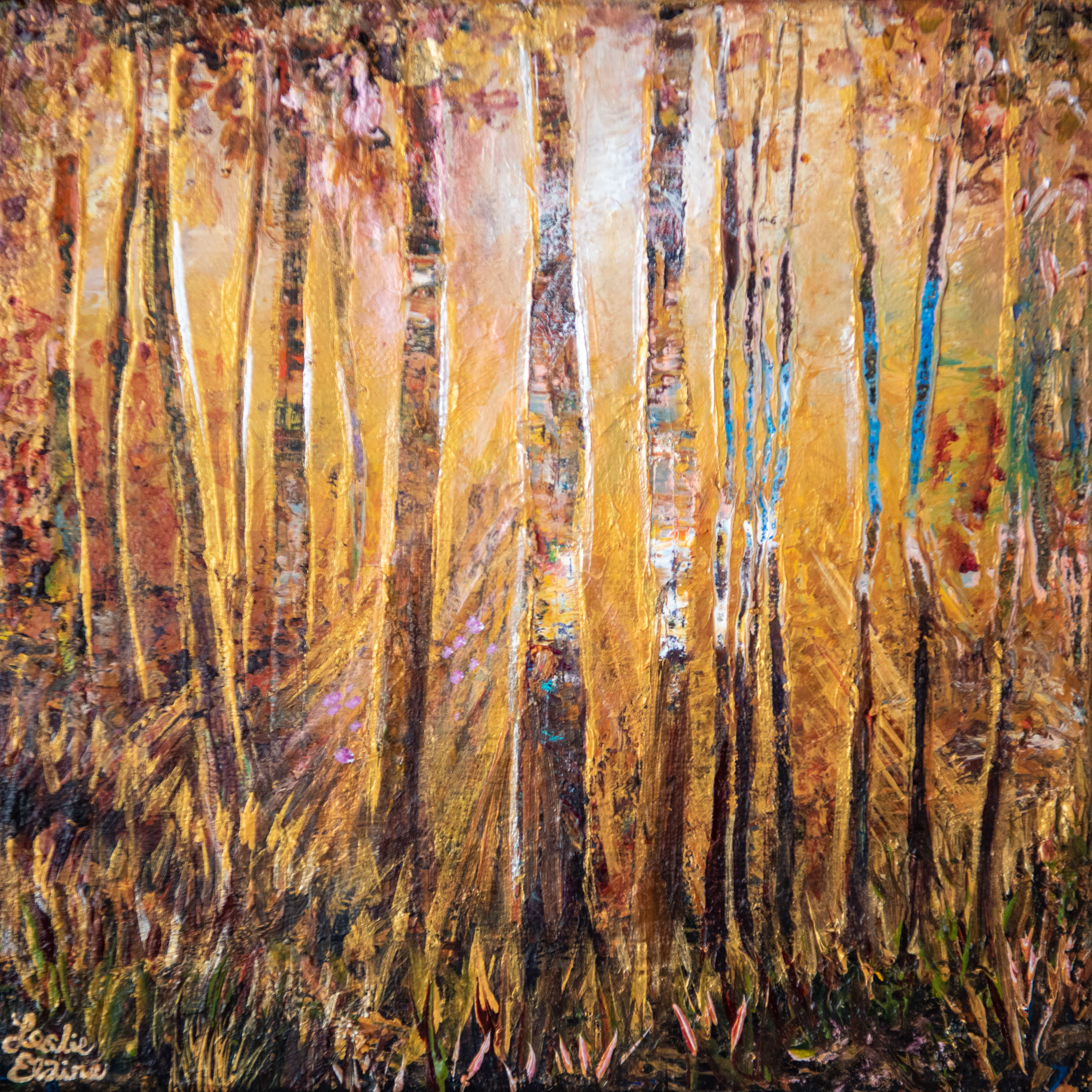Thoughts: This layered and interesting piece started as a palette, but the layers of color were so interesting when scraped down to a flat surface, that Leslie felt the colors and texture were reminiscent of tree bark. Taping over the background, then doing the rest of the piece with expressive brushwork and intricate outlines, Leslie created a forest with light streaming through.