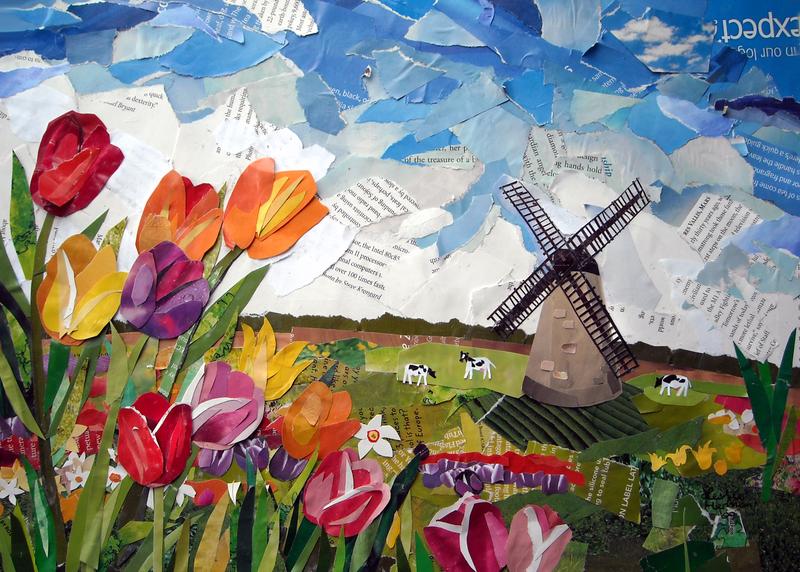 Thoughts: Mom says: This was made as a gift for Oma and Opa, Leslie's Dutch grandparents. The whole piece is created with magazine scraps, some ripped and some cut, even the windmill and the cows. The original is fading, but the print is exceptional (size 12" x 16".) Once someone looked at a framed print and argued it was the original because he could see the magazine paper peeling and curling. I told him it was a very good photograph print, but not the original, and he wouldn't believe me! The original is at Oma and Opa's house.